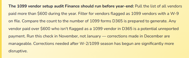 - Fix: Withholding tax and 1099 configuration is not a phase two item — it is a go-live requirement if the organization pays contractors, rents, royalties, or interest. The configuration is not complex, but it requires a complete vendor list review at go-live to ensure every vendor subject to 1099 reporting has the correct Box designation, TIN, and withholding group assigned. Run a test 1099 extraction in December using the full year’s payment data. Compare the output to the expected list of reportable vendors. Resolve gaps before year-end. January corrections to 1099 data after payments have been distributed are operationally painful and legally risky.