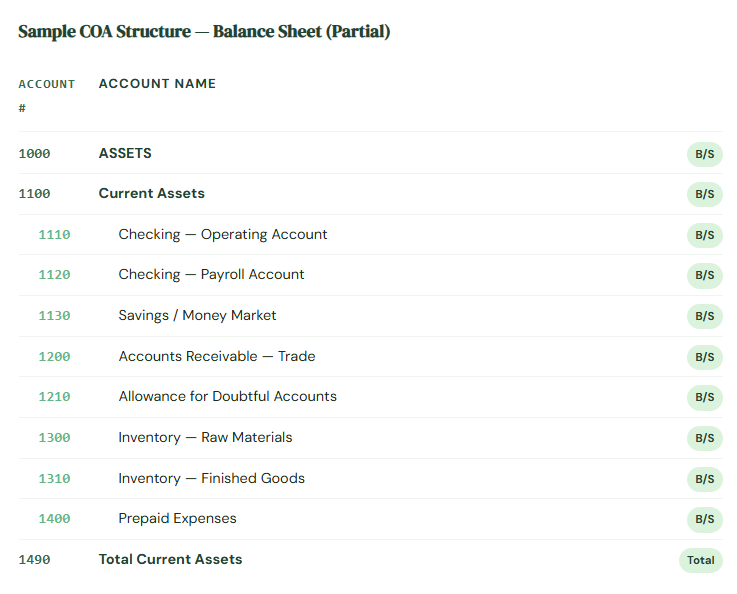 Notice a few things: the number ranges leave gaps (1110, 1120, 1130 — not 1111, 1112, 1113). That’s intentional. Gaps mean room to add accounts later without disrupting your numbering logic. Notice also that each account has a clear, unambiguous name — “Checking — Operating Account” rather than just “Checking.” When you have multiple bank accounts, clear names prevent a lot of confusion and mispostings.