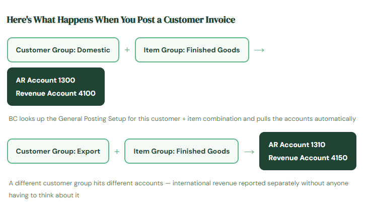 When you post a transaction in Business Central — say, a customer invoice — you don’t manually tell the system which accounts to hit. You don’t say “debit Accounts Receivable, credit Revenue.” The system figures that out automatically. How? Posting groups.