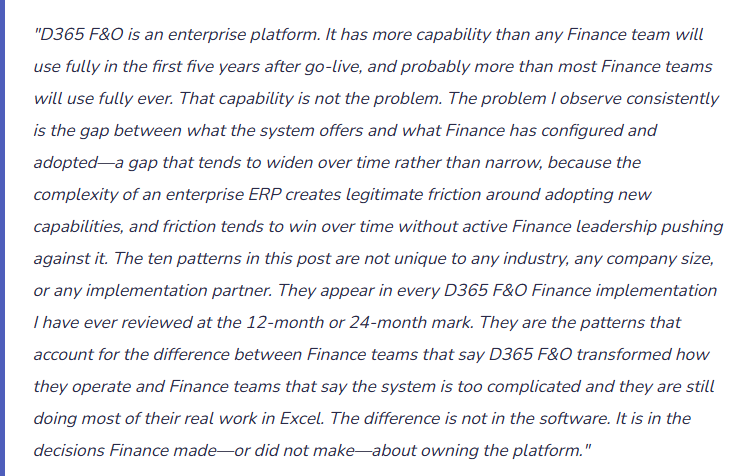What I hope Finance teams take from my blog posts so far… D365 F&O is an enterprise-grade Finance platform. The capabilities are documented documented — multi-book fixed asset management, intercompany transfer pricing, ASC 606 revenue recognition, DCAA-compliant project accounting, Electronic Reporting for global regulatory submissions, the Financial Period Close workspace, Cost Accounting, Finance Insights—are not aspirational features. They are available in the system Finance is already paying for. The organizations that use them do not have more resources, more technical capability, or more time than the organizations that do not. They have Finance leadership that treats the platform as something to be actively managed and developed, not passively used. They have Controllers who read the release plan before the wave hits production, who run the posting profile reconciliation every month, who built the Management Reporter library instead of the Excel alternative, and who assigned a backup owner to every Closing Cockpit task on the critical path. D365 F&O at full Finance utilization is a qualitatively different capability than D365 F&O as a transaction processor. My hope is to help Finance teams close the gap between the two.